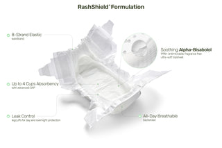 Now, our signature RashShield® Protection stops diaper rash before it starts, with 99%+ antimicrobial protection and soothing alpha-bisabolol woven into every Parasol diaper.