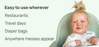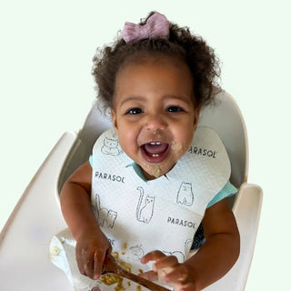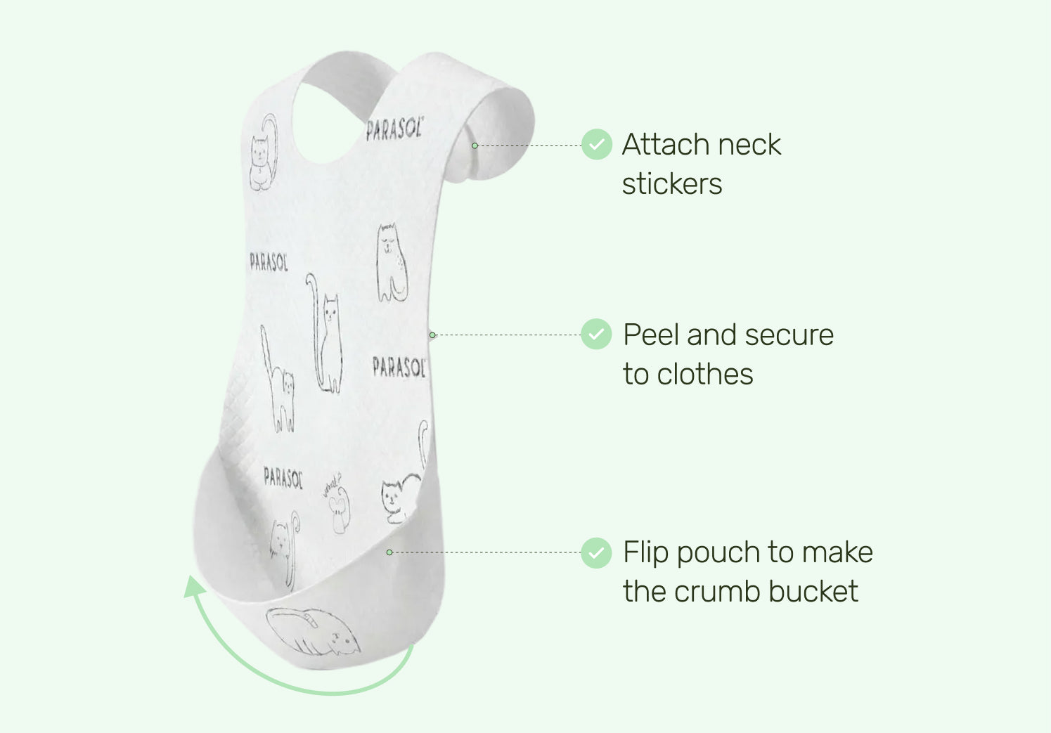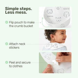 Parasol Disposable Bibs were created for real-life feeding moments. Each bib features a soft, absorbent top layer to help catch spills, a leak-resistant waterproof backing to keep clothes dry, and a fold-out crumb catcher that helps contain drips and runaway snacks.