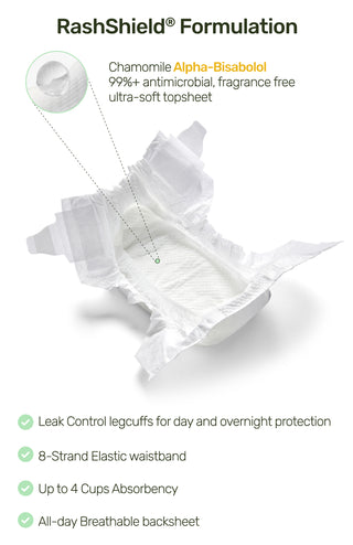 - Chamomile Alpha-Bisabolol RashShield®: Infused directly into the topsheet for 99%+ antimicrobial effectiveness to help prevent diaper rash before it starts. Alpha-Bisabolol is a gentle, skin-soothing active derived from the Chamomile flower.