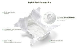 - RashShield® with Alpha-Bisabolol: Infused directly into the topsheet for 99%+ antimicrobial effectiveness to help prevent diaper rash before it starts.